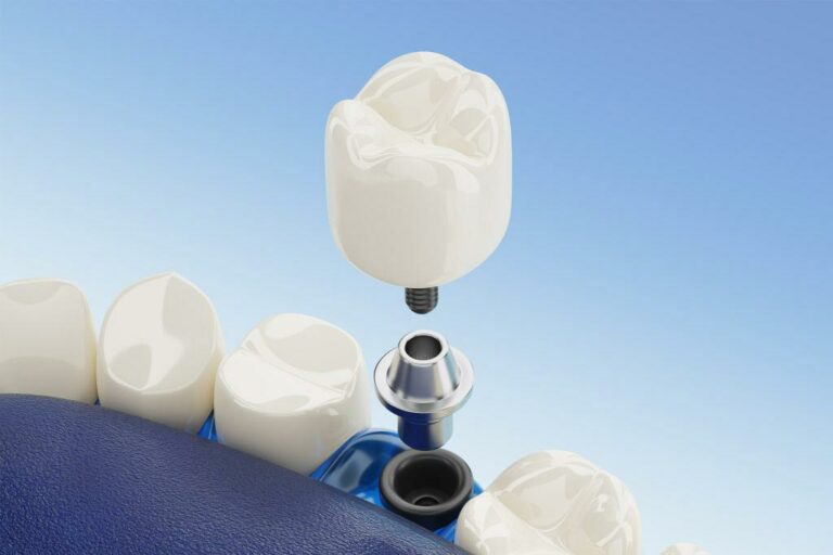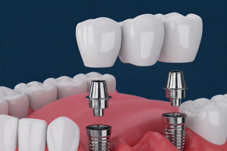 Un implant dentaire est un dispositif médical en forme de vis en titane qui est placé dans les mâchoires afin de remplacer les racines dentaires. Sur ces implants peuvent être placés des couronnes (schéma ci-dessous), des bridges (schéma ci-dessous), ou des moyens d’attache permettant de stabiliser des prothèses dentaires. Ainsi, il est possible de remplacer une ou plusieurs dents manquantes. Il est même possible de réhabiliter une mâchoire complètement édentée.